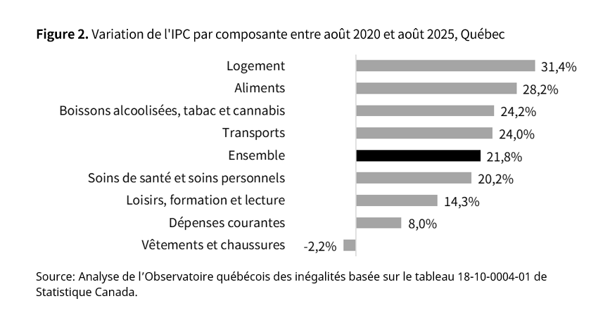 L’effet cumulé de la hausse des prix est saisissant : entre août 2020 et août 2025, l’IPC global a progressé de 21,8 %, avec des augmentations encore plus marquées au niveau du logement (+31,4 %) et de l’alimentation (+28,2 %).