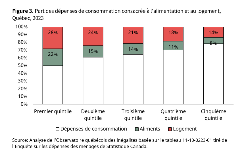 Le logement et l’alimentation, qui ont affiché les plus fortes hausses de prix, sont précisément les postes budgétaires qui occupent la plus grande part des dépenses des familles à faible revenu. En effet, les ménages appartenant au quintile inférieur de la distribution des revenus – soit les 20% les plus pauvres de la population – consacrent la moitié (50 %) de leurs dépenses de consommation au logement et à l’alimentation, alors que les ménages du quintile supérieur – les 20 % les plus riches – n’y allouent que 22 %, soit deux fois moins. Les ménages à faible revenu subissent donc un effet disproportionné de la hausse du coût de la vie.