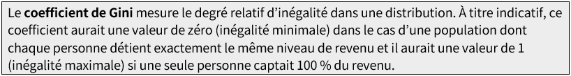 Les données d’enquêtes concernant la répartition des revenus dans la société canadienne nous permettent d’observer une réduction marquée et momentanée des inégalités de revenu après impôt en 2020 et 2021, en raison des aides financières d’urgence mises en place par les gouvernements durant l’état d’urgence sanitaire lié à la COVID-19. En effet, le coefficient de Gini (voir encadré) du revenu après impôt a diminué de 7,4 % au Québec entre 2020 et 2021, soit la plus forte variation annuelle enregistrée par les données d’enquête de Statistique Canada, pour remonter par la suite.