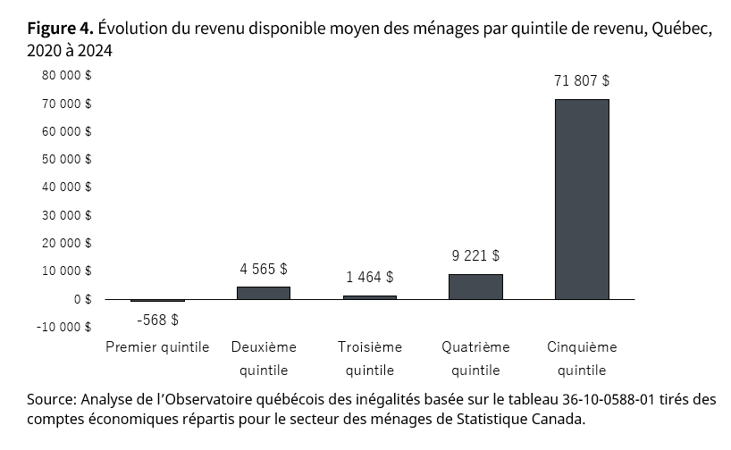 Toutefois, cette amélioration n’a pas profité également à tous. L’augmentation du revenu disponible s’est concentrée dans le haut de la distribution : tandis que le revenu disponible moyen des ménages du premier quintile – les 20 % les plus pauvres – a reculé de 568 $, passant de 29 875 $ à 29 307 $ (-1,9 %), celui des ménages du cinquième quintile – les 20 % les plus riches – a bondi de 71 807 $, passant de 139 660 $ à 211 467 $ (+51,4 %).