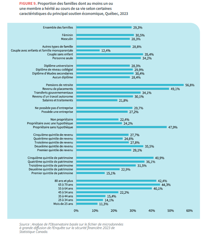- En 2023, au Québec, 29,3 % des familles ont déclaré qu’au moins un ou une de leurs membres avait reçu un héritage au cours de sa vie. Cette proportion varie selon divers facteurs, notamment l’âge et le niveau de richesse.