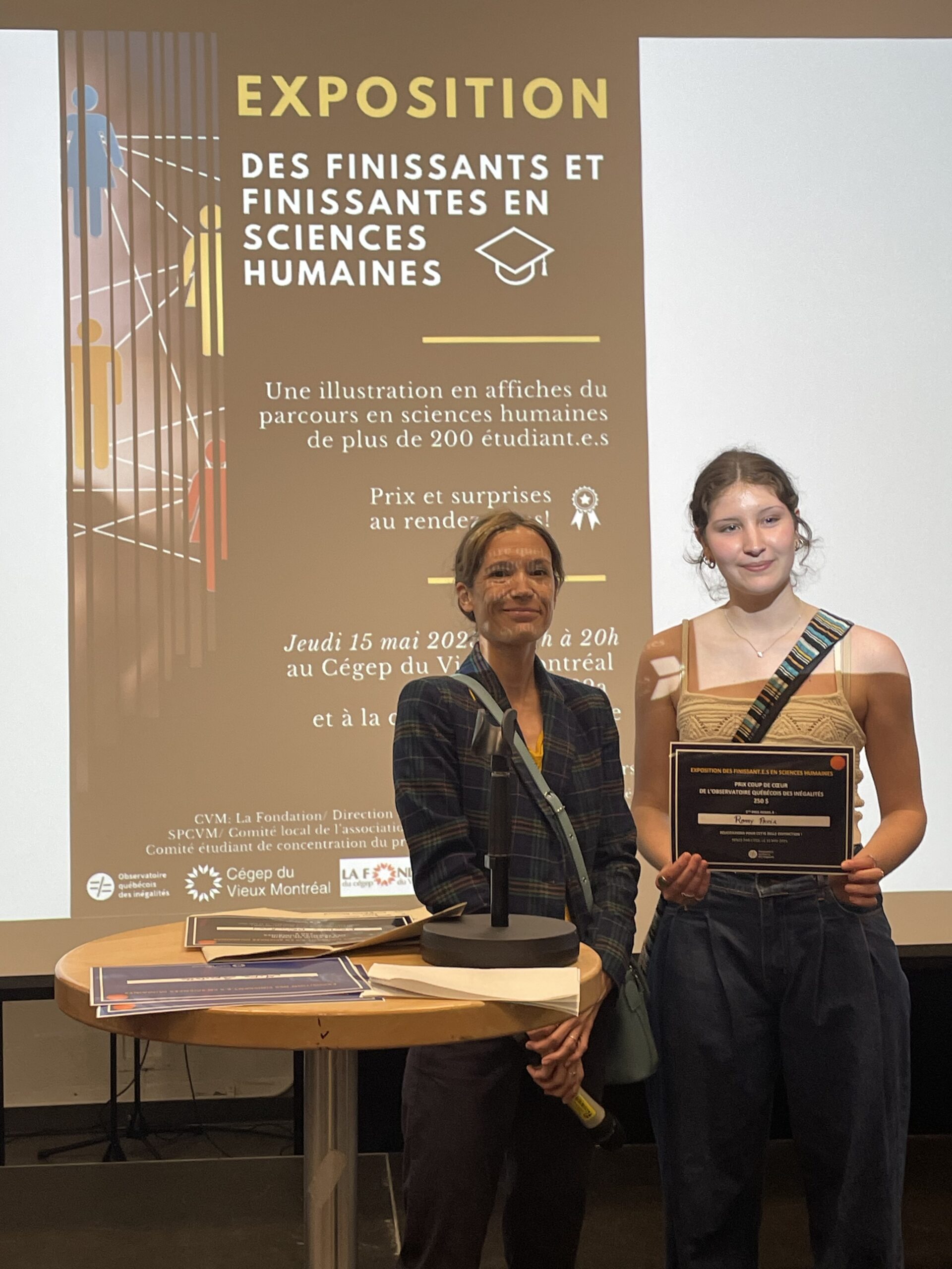 Les thématiques abordées par les étudiant·es dans le cadre de ce projet sont diverses. Toutefois, plusieurs se sont penché·s sur des enjeux liés aux inégalités — qu’elles soient socioéconomiques, culturelles, liées au genre ou à l’identité de genre. C’est dans ce contexte que l’Observatoire a été invité à remettre un prix coup de cœur à l’un·e des étudiant·es.